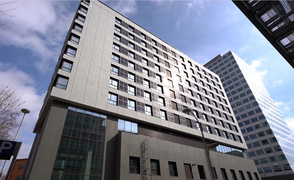 Asimismo, se contemplan numerosas medidas de eficiencia energética, en las que figuran: el uso de ecoenergías gracias a la conexión a la red de Distric-Heating & Cooling de Econergies para la producción de agua caliente sanitaria y la climatización por agua caliente de calefacción y refrigeración. También se incluye la instalación de paneles solares fotovoltaicos en la cubierta y en las fachadas sur y oeste, capaces de generar una energía eléctrica de 115 kW. Esto representará ahorros cercanos al 33%. Otro puento es el sistema de iluminación con led con detección de presencia para garantizar la máxima eficiencia. A ello hay que añadir el establecimiento de objetivos de máxima calificación energética (A) en emisiones de CO2, que redundarán en un ahorro energético del 60%.