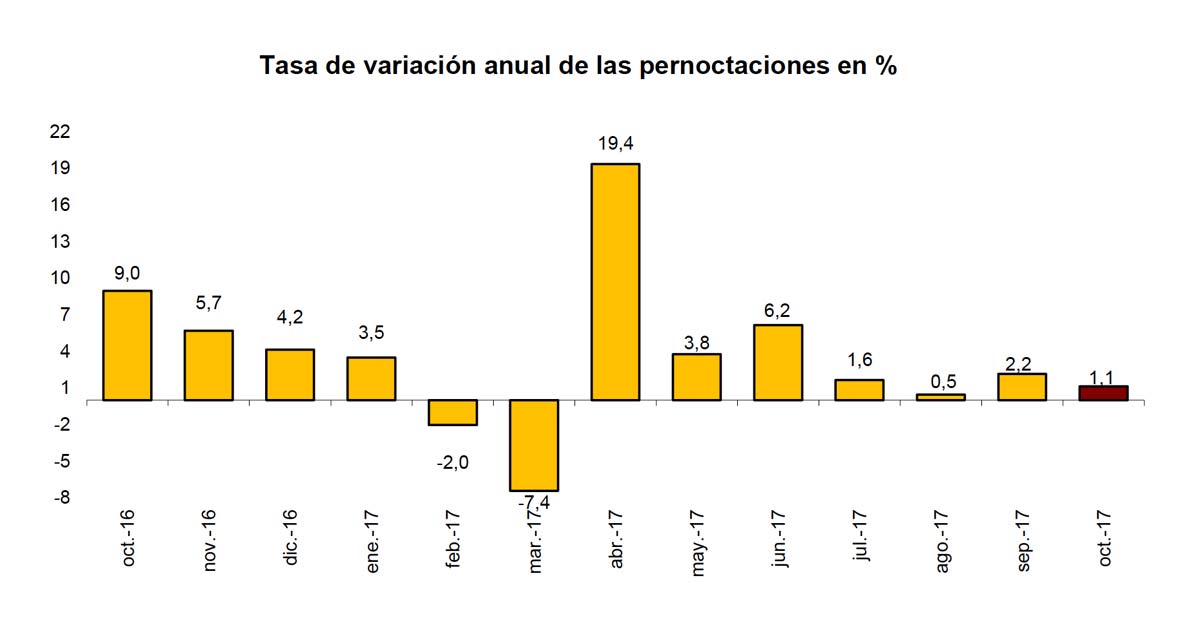 Durante los 10 primeros meses de 2017 las pernoctaciones hoteleras aumentaron un 2,8% respecto al mismo periodo del año anterior, según el informe de Coyuntura Turística Hotelera elaborada por el Instituto Nacional de Estadística (INE). Octubre Durante el mes de ...leer más