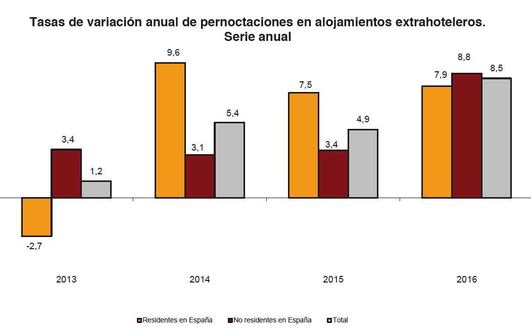 Las pernoctaciones en alojamientos turísticos extrahoteleros (apartamentos, campings, alojamientos de turismo rural y albergues) alcanzaron la cifra de 123,6 millones en el conjunto de 2016, un 8,5% más que en el año anterior. Las pernoctaciones de residentes aumentaron un 7,9% ...leer más