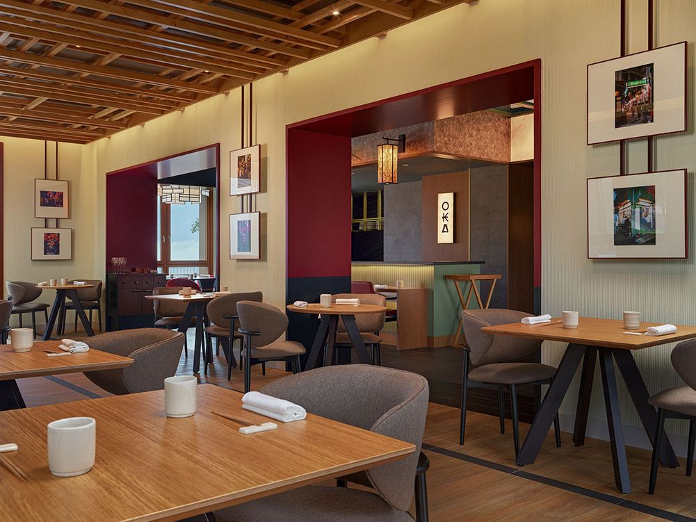 Oka es el restaurante japonés liderado por el reconocido chef Ricardo Sanz, dos estrellas Michelin y cinco Soles Repsol, pionero en la introducción de la alta cocina nipona y de la fusión japo-mediterránea en España, junto al chef Emiliano Laska. Su nombre, “Oka” (丘), que en japonés significa colina o atalaya, hace referencia a la ubicación privilegiada del hotel y a su condición de mirador sobre el territorio. Desde esa posición simbólica, la propuesta establece un diálogo entre la tradición culinaria japonesa y el territorio, integrando precisión técnica, estética y producto local.