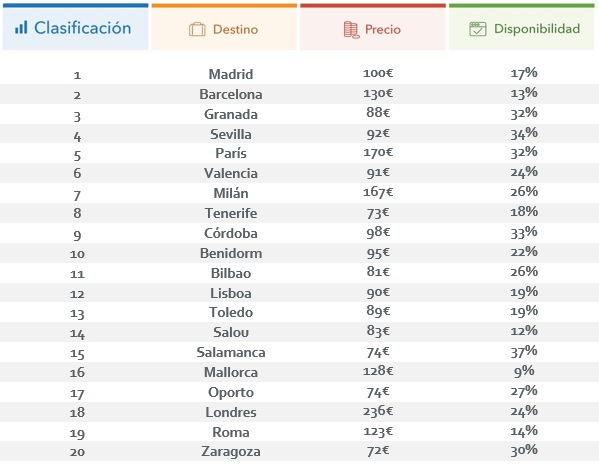 Los destinos se reparten por toda la geografía española, pero entre las primeras 10 posiciones destacan ciudades andaluzas como Granada, Sevilla y Córdoba. El ranking lo dominan destinos urbanos, tanto españoles como europeos, aunque también destacan ciudades de interior como Toledo y Salamanca y destinos de playa como Tenerife, Salou o Mallorca.