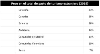 Los datos de Braintrust, a través de diferentes oleadas de su Barómetro Turístico, reflejan que las seis principales comunidades autónomas receptoras de turismo internacional acumulaban antes de la pandemia el 93% del gasto total -incidiendo en la concentración de destinos- conforme a la siguiente distribución: