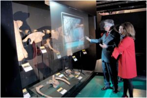 Por último, dentro de dichos elementos interactivos de dicha sala, disfrutaremos de un recurso museográfico novedoso que consiste en la posibilidad de obtener información multimedia de los fósiles (y de sus yacimientos de procedencia) a través de la actuación directa sobre el cristal de una vitrina escaparate que deja ver el contenido de la misma a través de la propia pantalla.