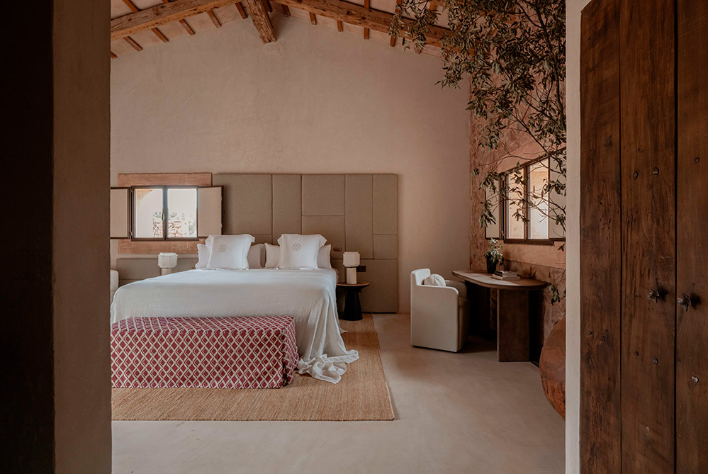 Binidufà cuenta con 11 habitaciones y suites, diseñadas para reflejar la calidez y suavidad del entorno del valle. Los interiores respetan el estilo característico de Vestige Collection: materiales naturales, tonos ricos inspirados en el paisaje que abraza la propiedad y un diálogo cuidado entre pasado y presente. Gran parte del mobiliario ha sido diseñado por Vestige Estudio y elaborado localmente, complementado con una cuidada selección de antigüedades y arte contemporáneo que aportan profundidad y carácter.
